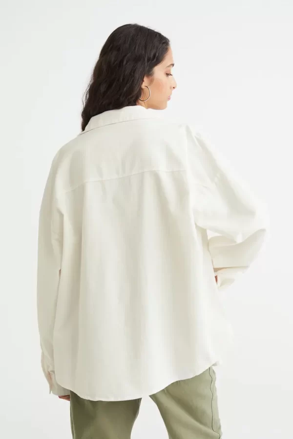 Oversized shirt in cotton corduroy. Collar, buttons at front, and yoke at back. Open chest pocket, heavily dropped shoulders, and long sleeves with button at cuffs.